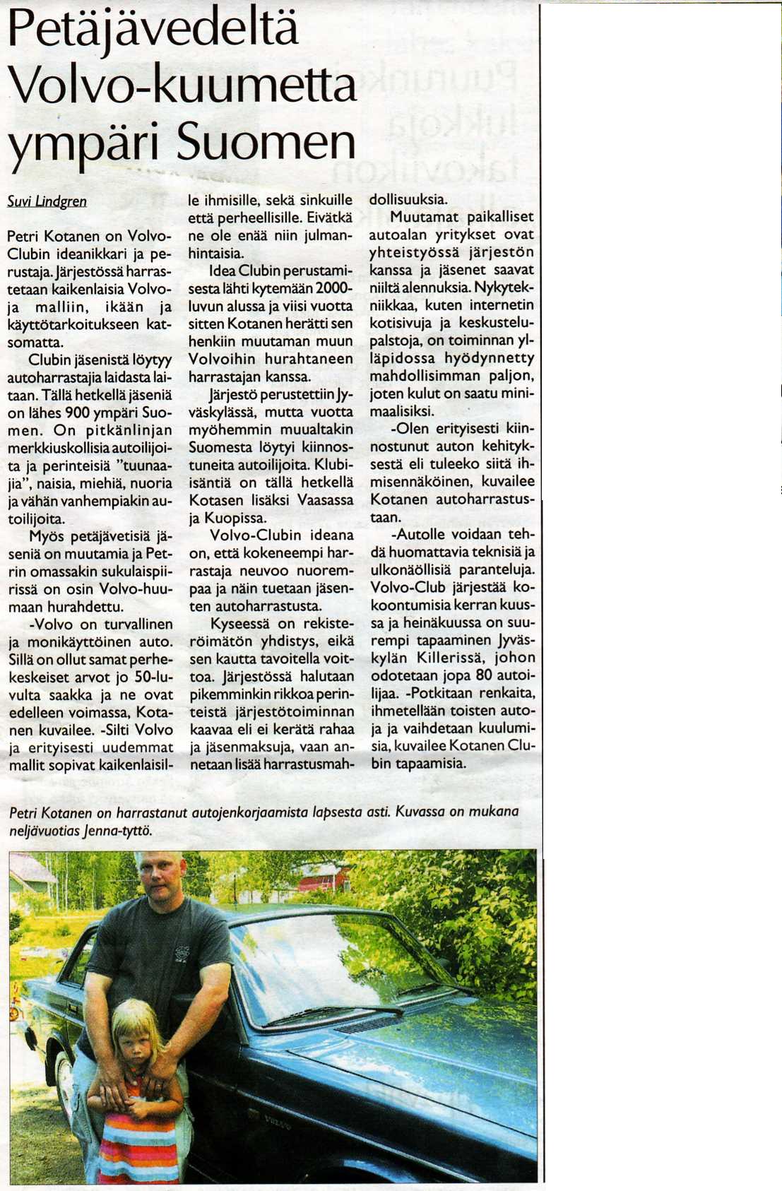 Firefox selaimella. Vanhojen foorumipalvelimien kadottua kartalta jouduimme luomaan foorumin uudeleen joten. Tutustu ja rekistöröidy foorumiin vasemmastalaidasta kohta keskustelu foorumi. HUOM: Galleria on poistettu käytöstä . Lehti juttu 1 juttu 2HUOMIO: Muistathan että volvo-club.net on tarkoitettu kokokansan käytöön Clubi-isäntien e-mail osoitteet: Eivät ole suoria linkkejä. pete(at)volvo-club.net Hallinointi / Jyväskylä jaippi(at)volvo-club.net Hallinointi / Vaasa live(at)volvo-club.net Alueisäntä / Kuopio Jos kysyttävää ilmenee, niin Pete sekä Jaippi auttavat mielellään. Volvo-Clubia luotsaa volvo_pete (Petri Kotanen) (Ylläpidon saa kiinni numerosta gsm 044-9909987 ) tai sähköpostitse. pete@volvo-club.net . Peten kohtalon hetki kuvassa -> Tästä kaikki sai alkunsa (huomaa vuosi kuvasta) On se sama la/cb tupla 4 / Petäjä 44 :n kulkuneuvo . Clubin oma irc-kanava #vcj on jälleen toiminnassa. Vaasan Volvo-Club ilmoittaa kokoontumisistaan myös lehdessä (Pohjalaisessa). Kiitos tästä kuuluu eräälle jäsenellemme. Uusi Clubin jaosto sinun paikkakunnallesi? Tässä infoa aiheesta: Pete etsii edelleen, eli jatkuvasti, innokkaita clubin vetäjiä. Jos sinua kiinnostaisi koota omalle paikkakunnallesi oma clubi niin lähetä sähköpostia tai soita, niin Pete auttaa alkuun. Clubin Isännät auttavat pulmissa, eli heiltä voit vapaasti kysyä jos jokin painaa mieltäsi. Clubiin liittyminen tapahtuu -kuten etusivullakin jo mainittiin- helpoiten siten, että rekisteröidyt Clubin foorumiin tai tulet mukaan kokoontumiseen. Mieluiten tietenkin molemmat, sillä silloin pystyt seuraamaan mitä clubissa tapahtuu ja saat jäsenyydestä eniten hyötyä. Luonnollisesti toivomme, että mahdollisimman moni tulisi kokoontumisiin koska uusia naamoja ja autoja on aina mukava nähdä. Kokoontumisissa on ollut hyvä tunnelma ja mukavaa porukkaa. Kaikki tämä luonnollisesti ilman jäsenmaksua! Ainoa menoerä on clubin tarra, jos siis sellaisen haluaa. Hintaa tarralla on vain 6€, eikä tarvitse ostaa sikaa säkissä, sillä tarroja on nähtävillä tapaamisissa.